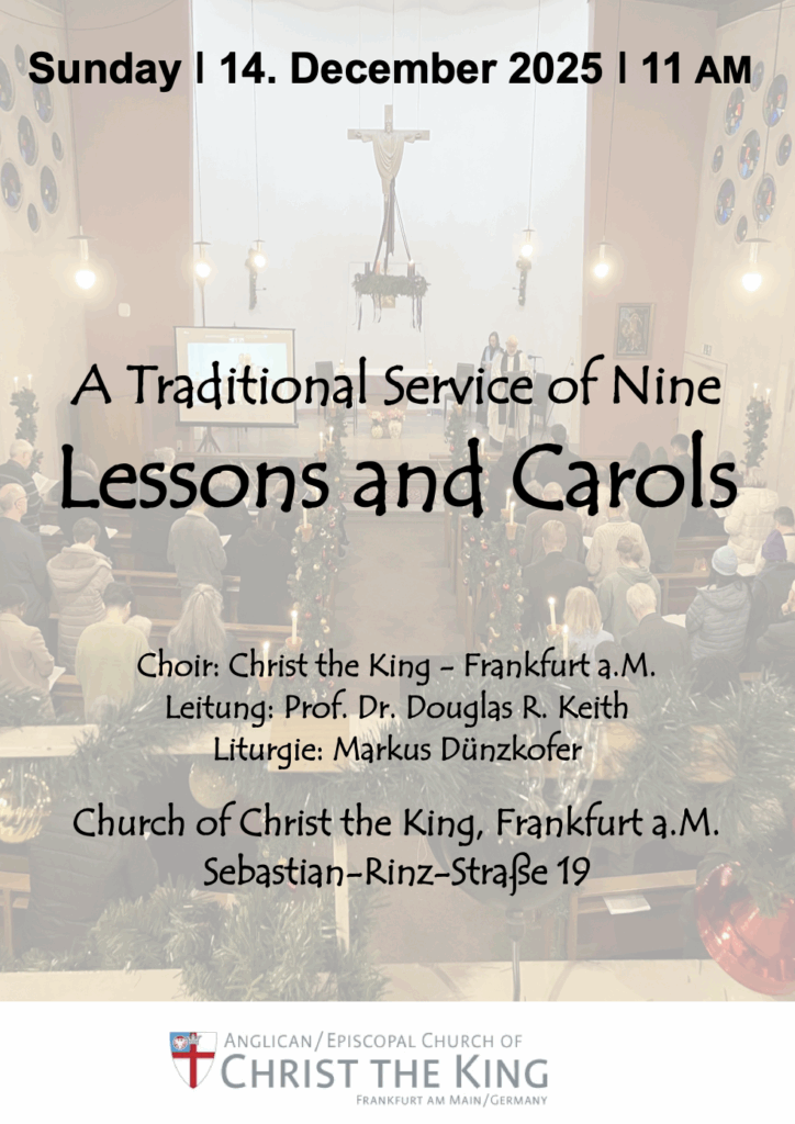 Carols are sung every Christmas at Frankfurt’s Weihnachtsmarkt, an essential venue for any local resident or tourist. Here the strains of “O come all ye faithful” can be heard through the scents of Glühwein and Bratwürste – everyone loves it. Other highlights of the year are the Service of Lessons and Carols during Advent and the Christmas Eve and Easter liturgies.